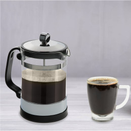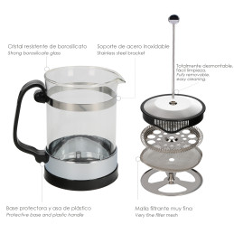 Cafetera con el clasico sistema de prensa francesa. Extrae mejor el sabor de los granos de café. No apto para microondas ni lavavajillas. Diseño elegante y robusto. Se desmonta con facilidad y se limpia rapidamente con agua y jabón.