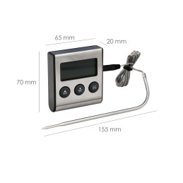 Cuenta con una pantalla LCD en la que se muestra la temperatura o el tiempo de cocinado programado. Sonda fabricada en acero inoxidable. Con una longitud de 155 mm. La sonda incluye un cable de 100 cm. de longitud