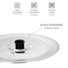 por lo que ademas de tapa antisalpicaduras se puede usar como colador. Cuenta con numerosas salidas de vapor.