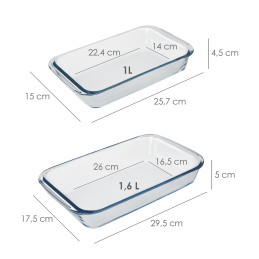 Fuente Horno Cristal Borosilicato Cuadrada 1,1litros. - Recipiente 1: medida interior / exterior: 22,4x14 cm. / 25.7x15 cm. - Recipiente 2: medida interior / exterior: 26x16,5 cm. / 17,5x29,5 cm. - Capacidad: 1 y 1,8 litros. - Libre de BPA. - Recipiente apto para microondas, congelador, lavavajillas y horno (temperatura maxima: 200º grados). - Clásico, funcional, duradero y resistente a las rayaduras. - Resistente a temperaturas altas y bajas. - Cristal de borosilicato de alta calidad, que al ser un material no poroso, no transfiere sustancias nocivas, y no conserva olor ni sabor de alimentos contenidos anteriormente. - Fácil limpieza y apto para lavavajillas. - Gracias a sus practicas asas, se obtiene un agarre mas seguro. Ideal para ensaladas, postres, cocina, respostería, etc. - Articulo tambien conocido como fuente de cristal, molde de cristal o bol de cocina.