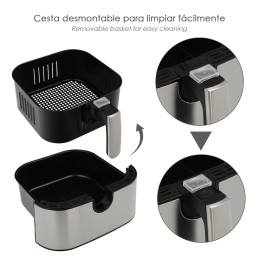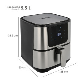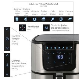 Potencia: 1800 W. Capacidad 5.5 litros. Ajuste de temperatura de 80 a 200º C. Temporizador de hasta 60 minutos.